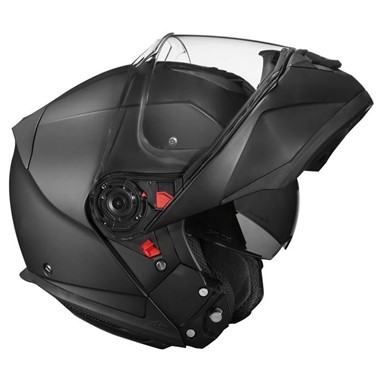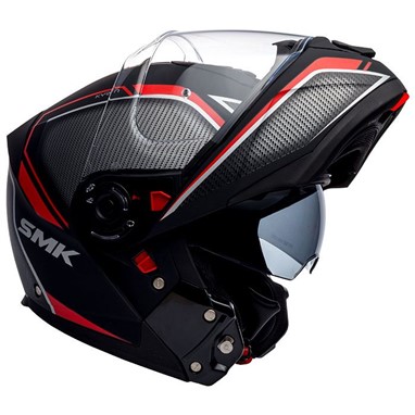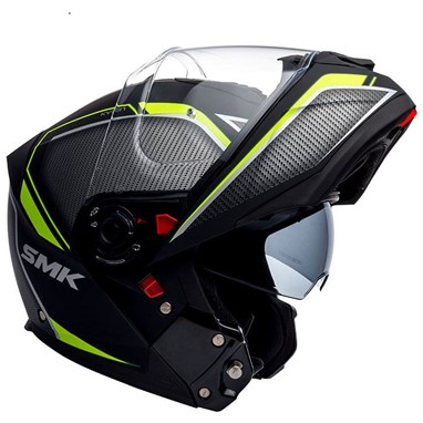 Devido à sua dupla homologação (P/J), o SMK Glide pode também ser usado de forma segura com a queixeira aberta, bastando ativar o sistema de fixação específico. Para fechá-lo, e torná-lo num capacete integral, basta puxar a queixeira para baixo até que o sistema de fixação actue.
