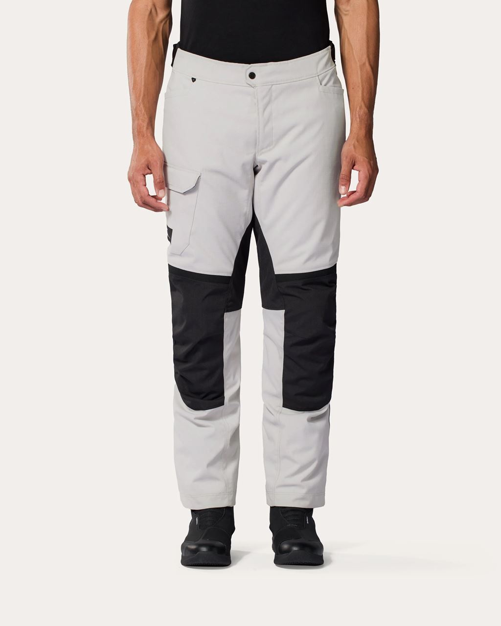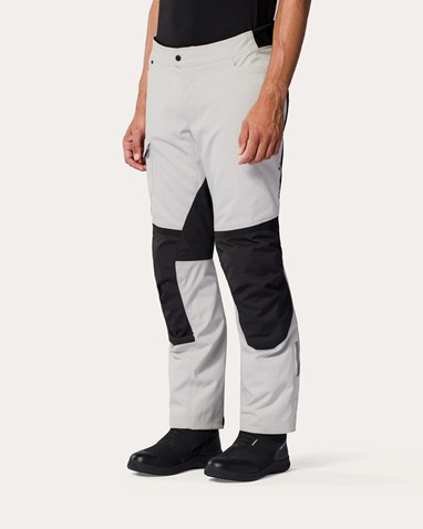 O ajuste é assegurado por tiras reguláveis na cintura e fechos de velcro na bainha, permitindo adaptar as calças ao corpo e ao tipo de bota utilizada. A ligação por fecho ao blusão evita a entrada de vento e protege a zona lombar, enquanto os painéis de aderência ajudam a manter estabilidade na posição de condução.