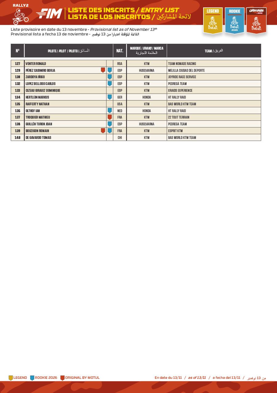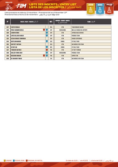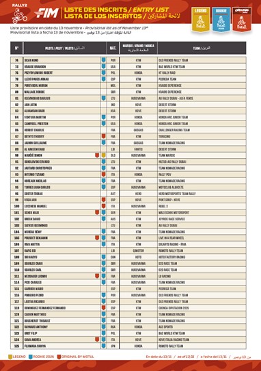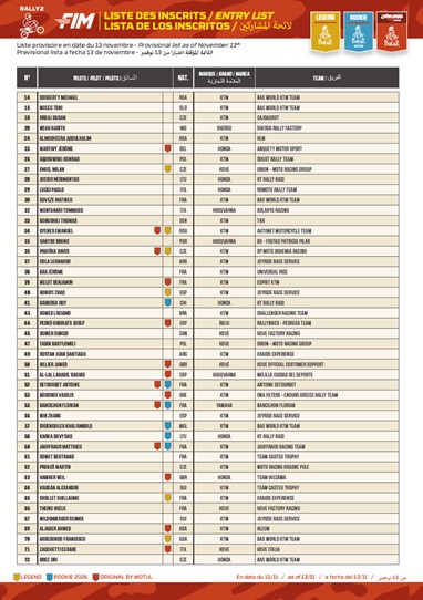 A lista oficial de inscritos já revelada contém os nomes dos pilotos e equipas num total de 325 veículos: 118 motos FIM e 207 inscrições FIA: 72 na Ultimate, 37 na Challenger, 43 SSVs, 8 na Stock e ainda 47 camiões.