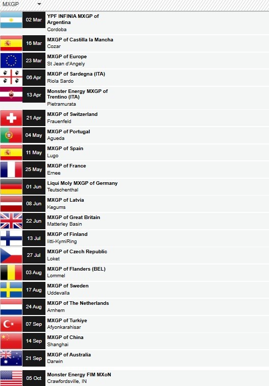 O campeonato de MXGP arrancou na Argentina, no novo circuito em Córdoba, nos dias 1 e 2 de março. O francês Febvre Romain venceu a primeira corrida da principal categoria do campeonato, o MXGP, tendo o compatriota Maxime Renaux levado a melhor na segunda corrida do Grande Prémio argentino. Na soma das duas mangas, Renaux e Romain contabilizaram ambos 47 pontos.