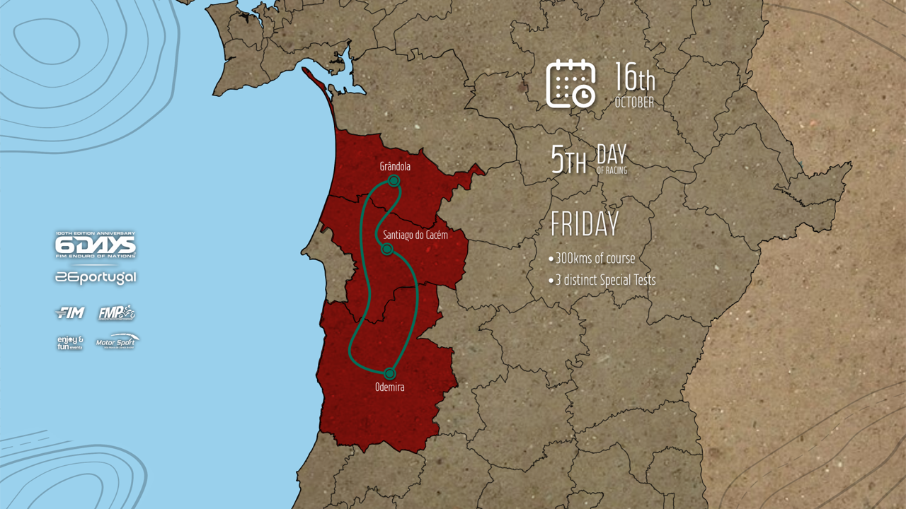 No 5º dia a prova ruma um pouco mais a sul, num percurso entre Grândola, Santiago do Cacém e Odemira. No total, os concorrentes terão pela frente cerca de 1400 km de percurso, culminando, no sábado 17 de outubro, na especial de motocross final com partidas em linha, que encerra tradicionalmente os ‘Seis Dias’ e que terá lugar, previsivelmente, no concelho de Sines.