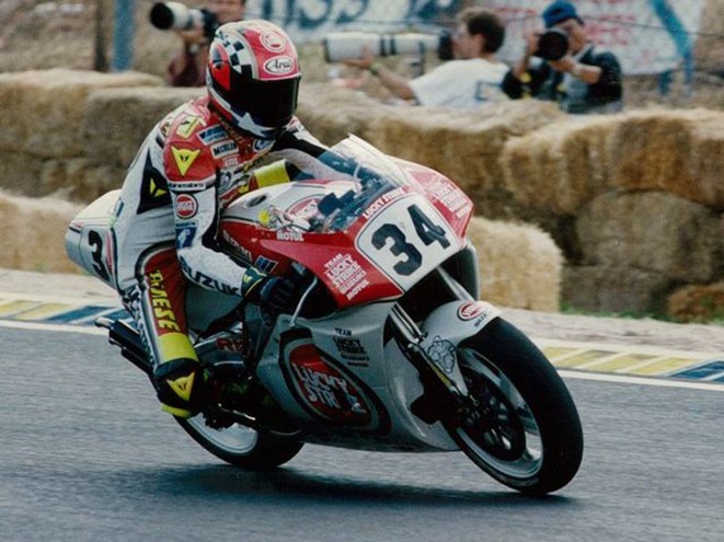 A Suzuki RGV500 Gamma que deu vitórias a Schwantz e Barros nesse ano já pouco tinha em comum com a RG500 original de 1974, para lá do nome no depósito e cilindrada de 498cc. A potência do motor ascendia aos 165 cv às 12.800 rpm, contra aí uns 130 máximos da RG original. Era a primeira aplicação do “big bang”, e as cambotas rodavam no sentido inverso ao do movimento, para ajudar a roda da frente a manter-se no chão. O quadro dupla-viga fora extraordinariamente compactado, fazendo da Suzuki uma das motos mais baixas do “paddock”, mas era na ferocidade da sua resposta que residia a sua dificuldade, até à adopção do motor “big bang”.