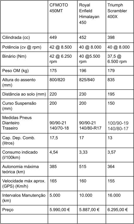 Será o tipo de utilização que definirá a escolha: a CFMOTO 450MT para uma utilização mais exigente fora de estrada, tendo em conta os seus consumos de combustível um pouco mais altos e os intervalos de manutenção mais curtos, a Royal Enfield Himalayan 450 para uma utilização mais turística e polivalente, aproveitando o seu conforto e grande autonomia para tiradas maiores, e a Triumph Scrambler 400X para uma utilização preferencialmente urbana, mas capaz de umas esporádicas incursões por maus caminhos, aproveitando a sua agilidade no trânsito e a sonoridade do seu motor para alegremente “ir ali num instantinho”.