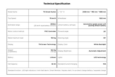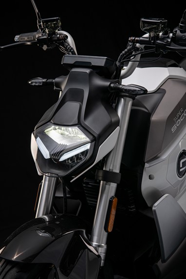 A Super Soco TS Street Hunter foi completamente repensada e redesenhada. Apresenta-se agora como a mais desportiva e potente da gama, com um estilo marcadamente streetfighter O novo desenho, mais encorpado e musculado, incorpora pequenas asas aerodinâmicas laterais, que contribuem para aumentar a estabilidade e um novo e agressivo farol que, tal como toda a iluminação, recorre à tecnologia LED.