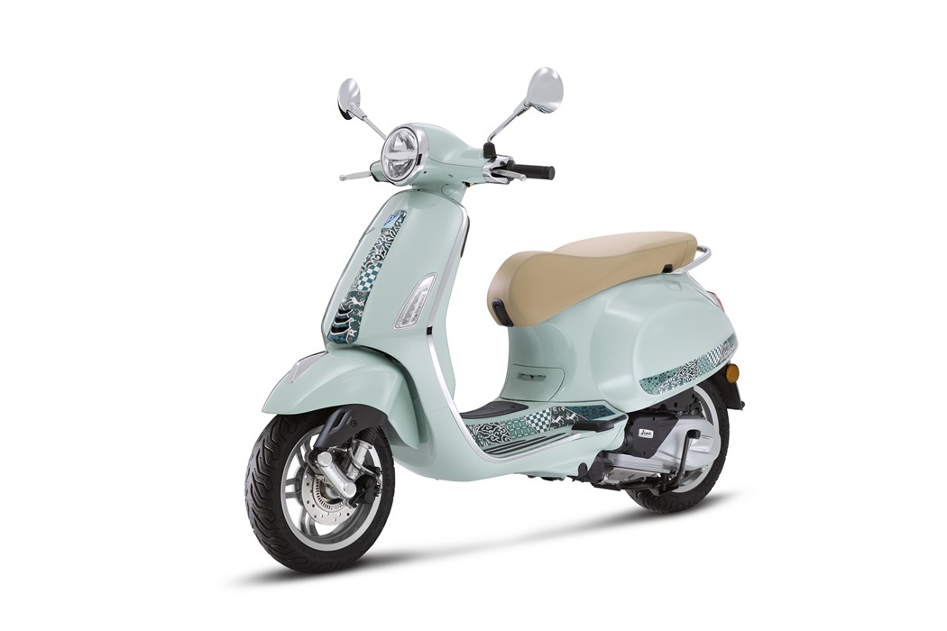 As decorações Batik que adornam a Vespa Primavera são aplicadas usando a tecnologia Water Transfer, começando pelo “cravattino”, o friso característico e distintivo na frente, bem como embelezando a abertura do porta-luvas no escudo aerodinâmico e correndo ao longo da plataforma e das laterais da Vespa. O assento, de cor castanha clara com costuras em tons de verde, acrescenta uma sensação natural, recordando as cores das praias ensolaradas.