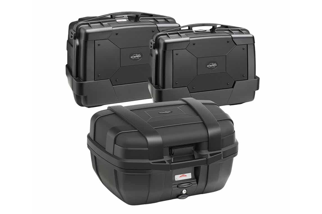 Top case KGR52NN: com capacidade de 52 litros, pode acomodar confortavelmente dois capacetes modulares e inclui um sistema de fecho de segurança, além de pegas para facilitar o transporte à mão.