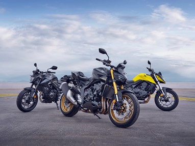 As pinças de travão da Nissin, radiais e de quatro êmbolos, atuam sobre discos flutuantes de 310 mm na dianteira e um disco de 240 mm com pinça de um êmbolo na traseira, garantindo uma travagem potente e segura. Os pneus, de medidas 120/70-ZR17 à frente e 180/55-ZR17 atrás, montados em jantes de alumínio fundido, foram projetados para garantir máxima aderência e controlo, nas mais diversas condições de estrada.
