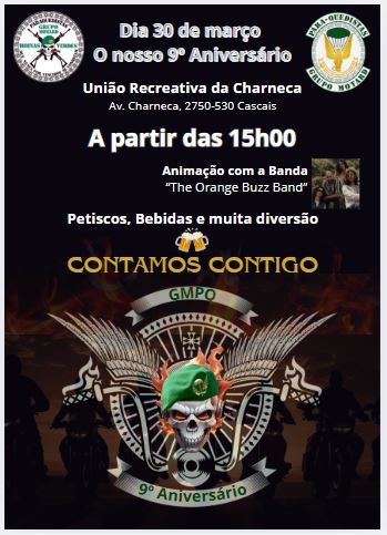 O Grupo Motard Pára-Quedistas vai celebrar o seu 9.º aniversário no próximo dia 30 de março de 2025. O encontro terá lugar na União Recreativa da Charneca, localizada na Avenida da Charneca, em Cascais, e começará às 15h00.