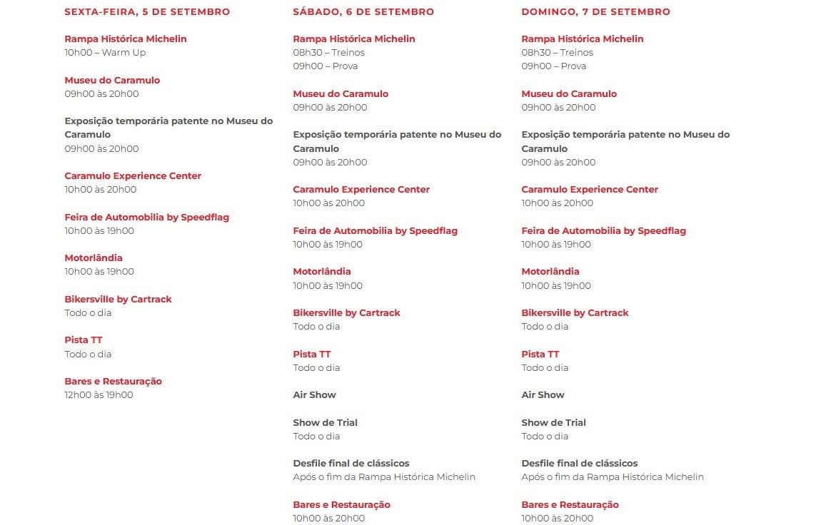 Assim, ao longo do primeiro fim de semana de setembro, começando logo à sexta-feira, a festa no Caramulo é dedicada a todas as idades e a todos os estilos, sempre com um forte pendor para os veículos clássicos.