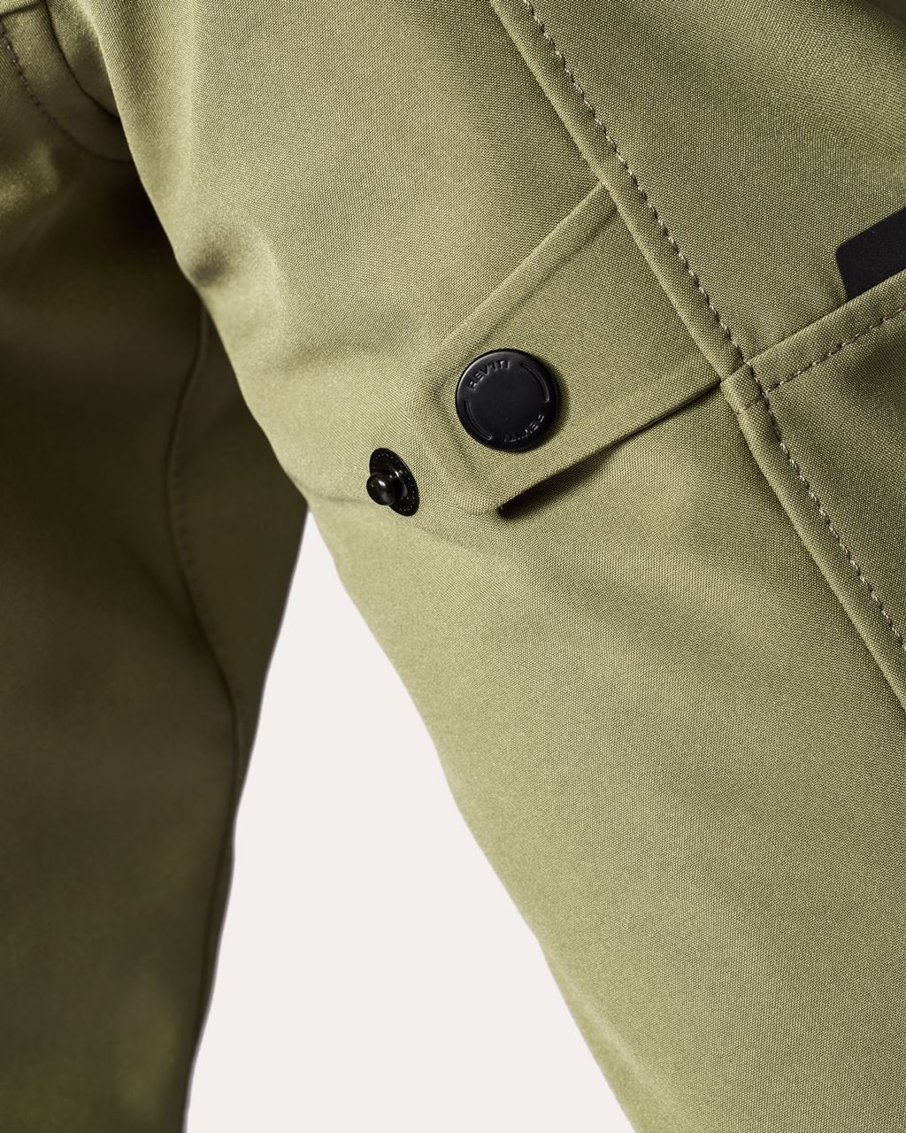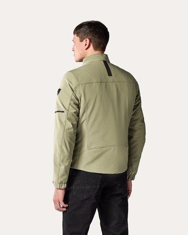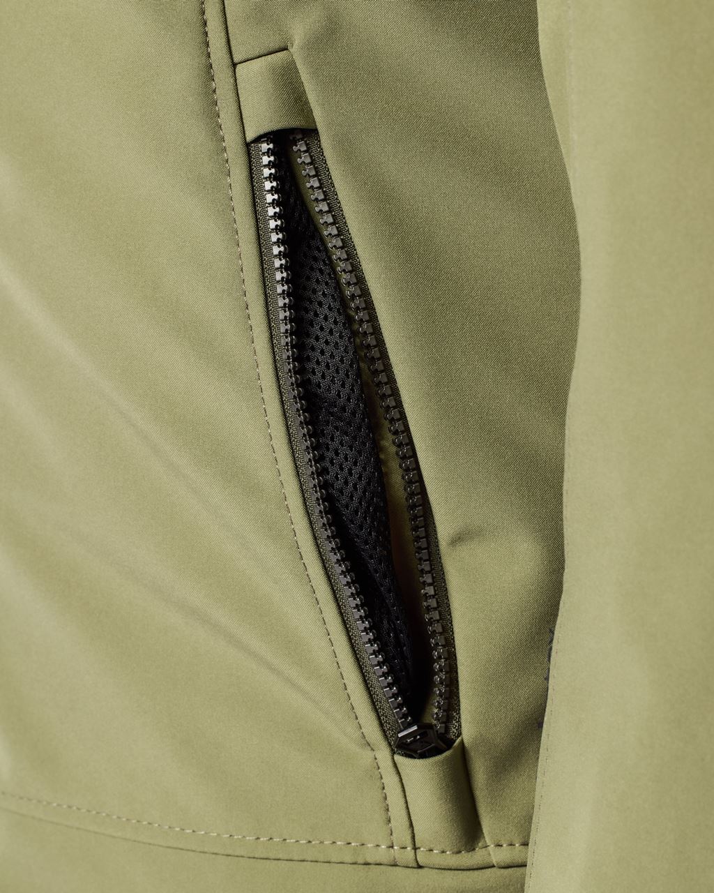 A peça é integralmente confecionada em tecido softshell, um material que garante uma sensação de bem-estar notável, combinada com um corte de linhas depuradas e elegantes. Esta abordagem demonstra que a simplicidade conceptual pode, efetivamente, resultar em peças visualmente impactantes e cheias de carácter.