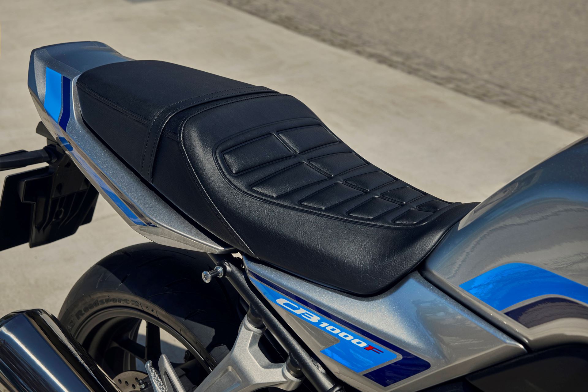 Por isso o design da CB1000F concentra-se no essencial, com traços bem vincados que fluem do depósito, passando pelas tampas laterais e pelo assento, até à carenagem traseira. O nostálgico farol redondo é ladeado por duas bem visíveis buzinas e os gráficos arrojados do depósito e das tampas laterais são inspirados na moto com que Freddie Spencer alinhou nas provas AMA.