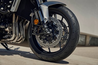 A travagem é assegurada por pinças de travão dianteiras radiais de quatro êmbolos, que trabalham em discos flutuantes de 310 mm e as jantes de alumínio fundido montam pneus 120/70-ZR17 e 180/55-ZR17 na frente e atrás.