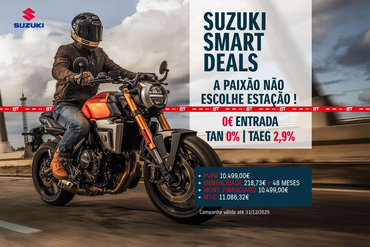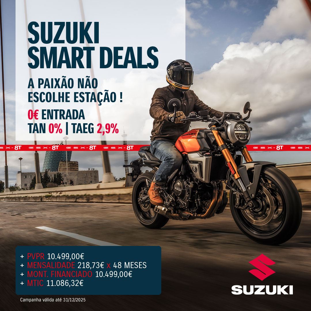 A Suzuki Portugal lançou a campanha "Suzuki Smart Deals", oferecendo aos motociclistas a oportunidade de adquirir uma moto nova sem custos de entrada e Taxa Anual Nominal (TAN) de 0%. A iniciativa, válida até ao final do ano, abrange uma vasta gama de modelos, incluindo as recentes novidades de 2025, como as GSX-8T, GSX-8TT, DR-Z4S e DR-Z4SM.