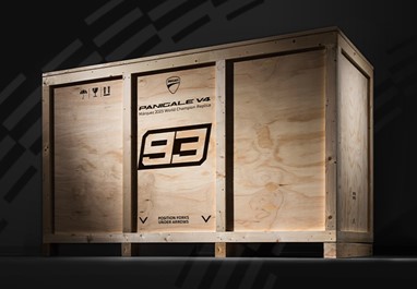 Todas as Panigale V4 Márquez 2025 World Champion Replica serão entregues numa caixa de madeira personalizada, com um certificado de autenticidade e o proprietário irá receber também uma caixa para guardar os acessórios quando não estiverem a ser usados na moto, incluindo uma capa para a proteger.