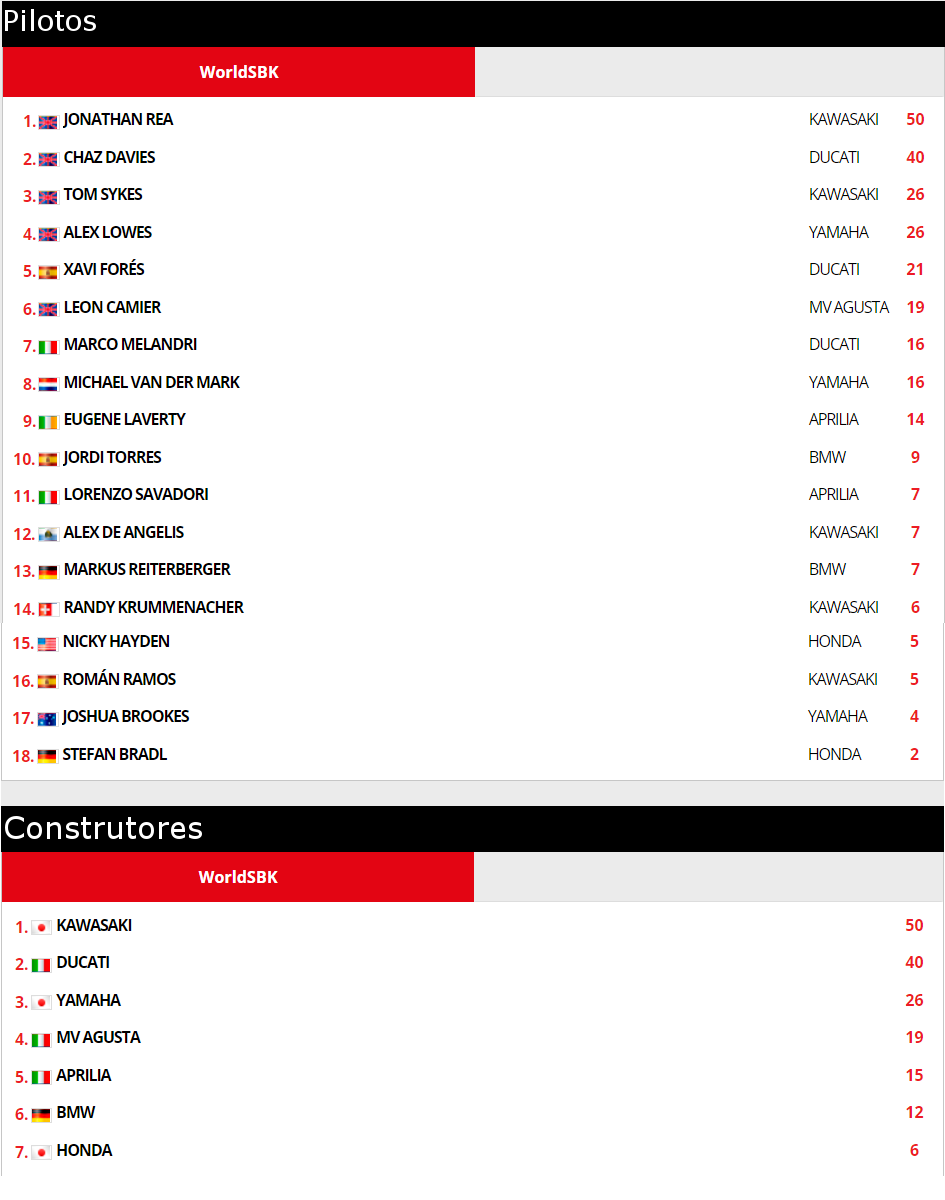 Seria omisso não falar da boa forma de Xavi Forés, que começou por andar sempre nos primeiros 3 durante os treinos, consolidando isso nas corridas com um 6º e um 5ºlugares, mais uma vez ilustrando a pequena diferença que separa as motos oficiais de Borgo Panigale das “outras” da mesma marca... falando das marcas, se a Yamaha mostrou um ar da sua graça, decerto devido ao trabalho pré-época de Lowes, já a Honda ficou aquém do esperado... novo piloto de nome sonante vindo da MotoGP e novas cores Red Bull não ajudaram a também nova Fireblade a impor-se, acabando Hayden por cair e nem marcar pontos na segunda corrida e Bradl por ficar em 15º em ambas... a caminho da Tailândia, a Ten Kate tem de interrogar-se sobre o que está mal, ou poderá nunca ter a chance de recuperar no Campeonato que regressa a Portimão este ano...