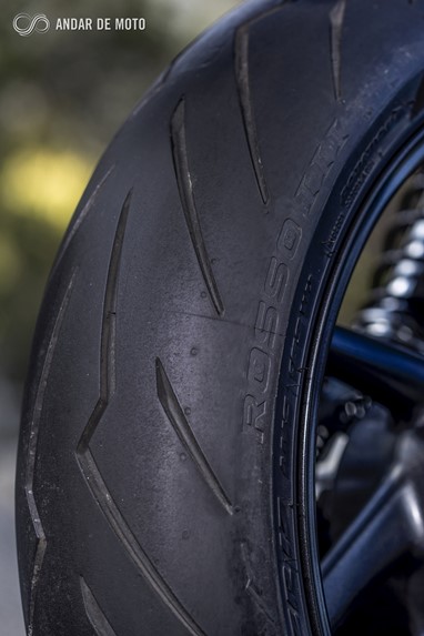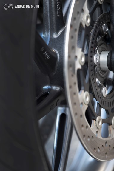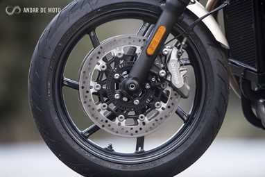 O ABS também beneficia dos bem escolhidos pneus Pirelli Rosso que, em conjunto com as maxilas Brembo da roda dianteira, asseguram uma excelente capacidade de travagem. A roda traseira controla-se facilmente com a pinça Nissin, flutuante, que morde um disco de 220mm.