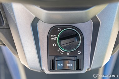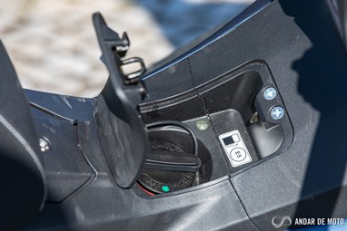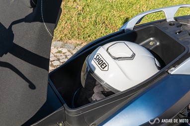 Debaixo do assento o espaço disponível até parece ser bastante. No entanto a forma esguia do compartimento impede a colocação de objetos largos. A altura interior livre também não é particularmente grande, pelo que apenas conseguimos colocar e fechar o assento usando um capacete jet.