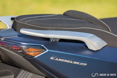 As carenagens adotam formas claramente desportivas, com ângulos vincados e linhas aerodinâmicas que seguem uma imagem bem conseguida desde o frontal onde se destaca a dupla ótica, até à traseira afilada. A iluminação é totalmente em LED. E destaco ainda a opção, bem conseguida, de embutir as luzes de mudança de direção dianteiras nas carenagens laterais. Acima de tudo a Vieste 125 parece, desde o primeiro momento em que estamos ao seu lado, uma scooter bem conseguida em termos de design e detalhes.