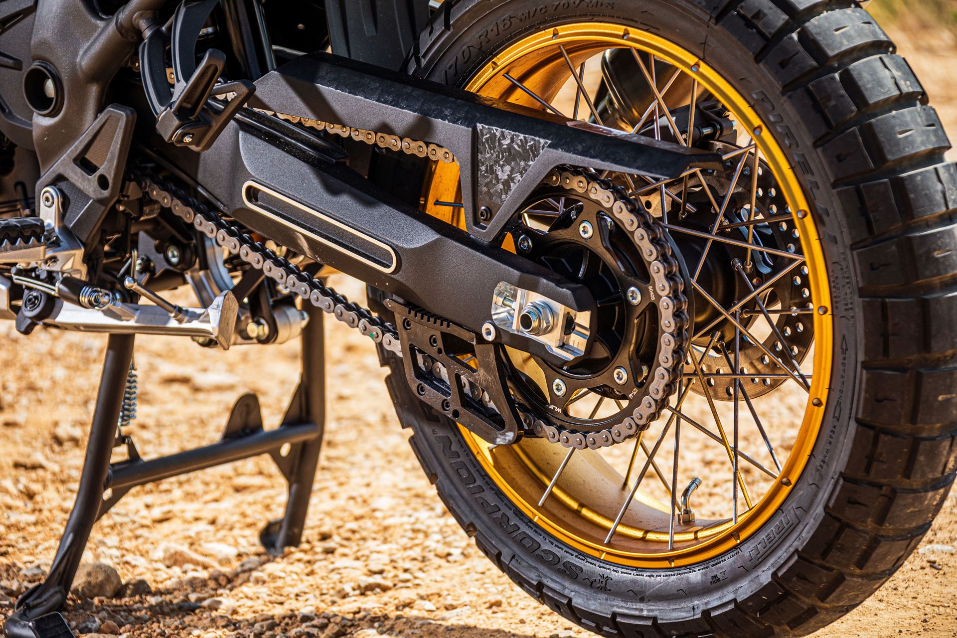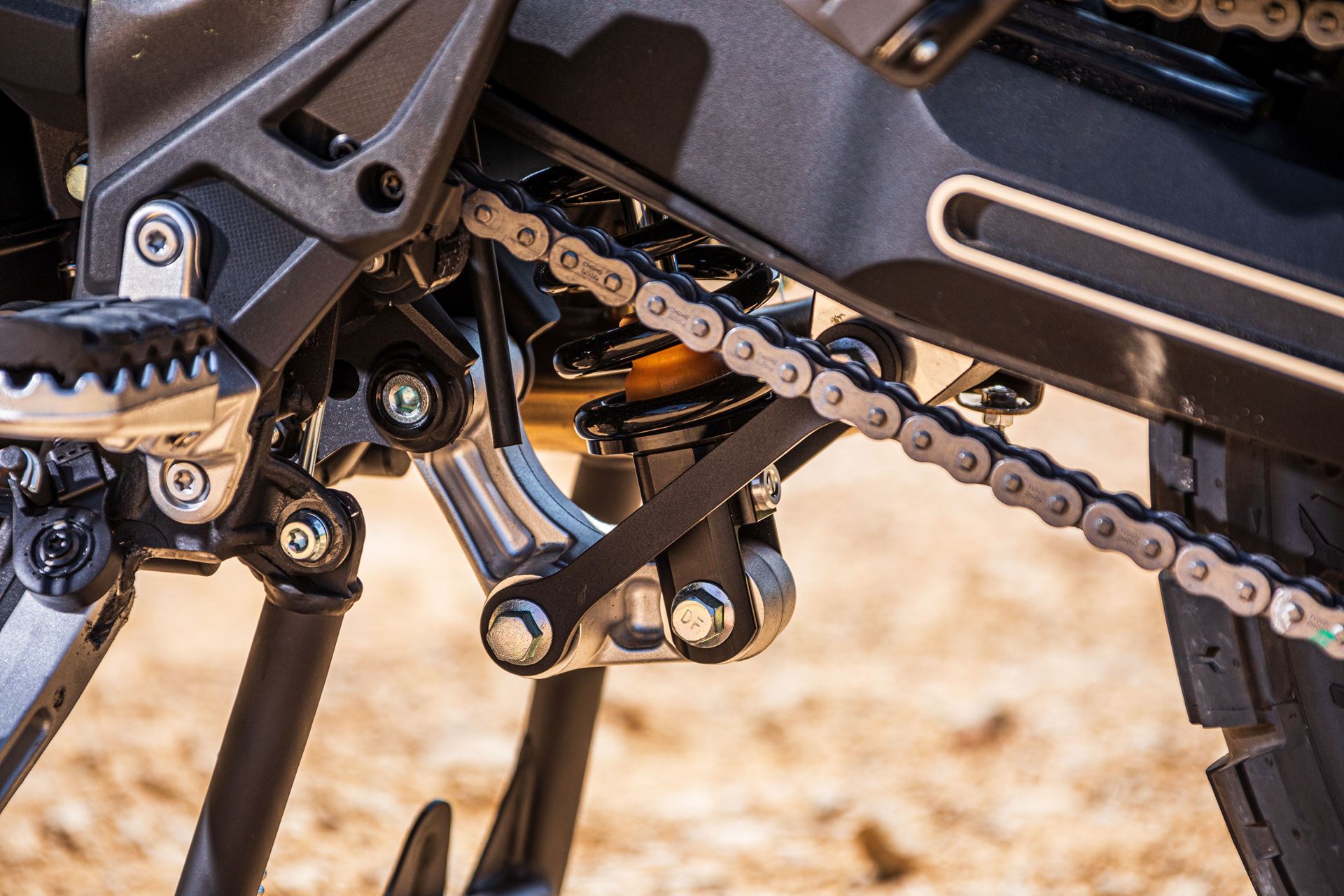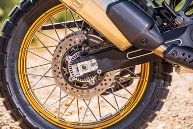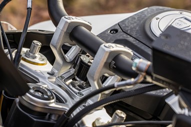O braço oscilante de alumínio fundido numa só peça, é 25% mais leve do que um equivalente noutro metal, o que ajuda a melhorar o desempenho da suspensão. Um amortecedor da direção rotativo e regulável, de desenho compacto, mantém o guiador firme aumentando a confiança.