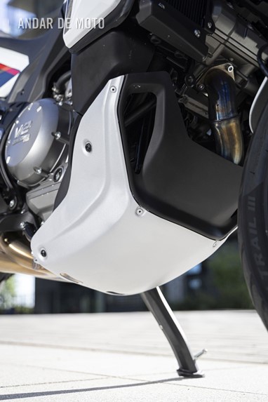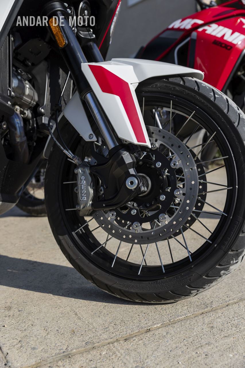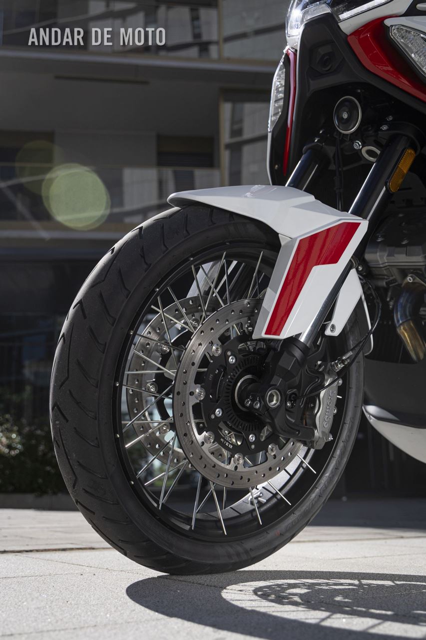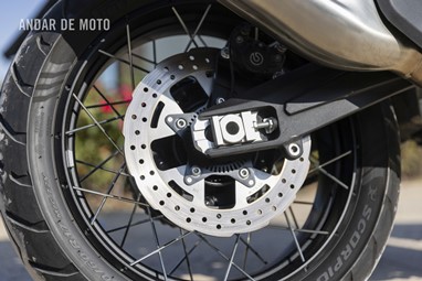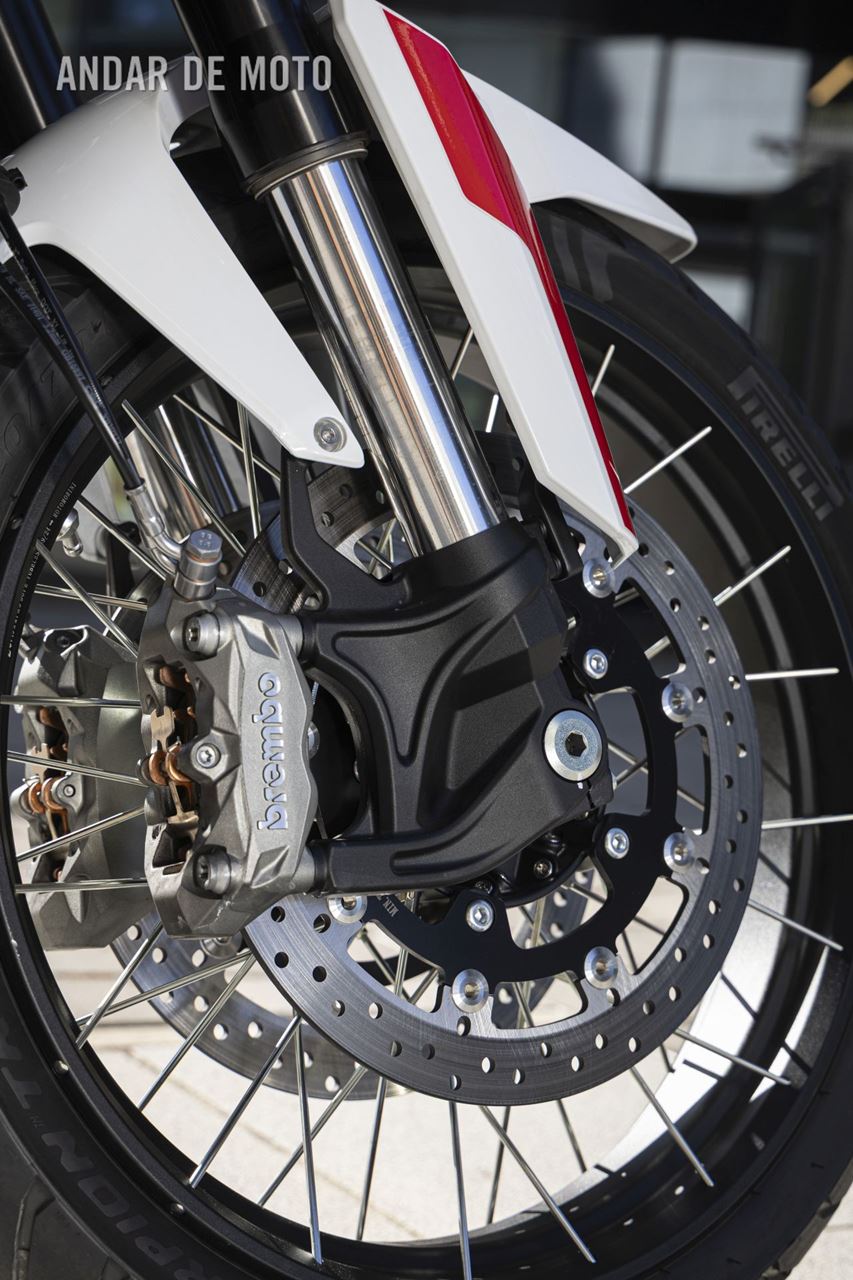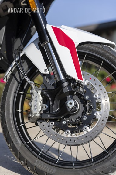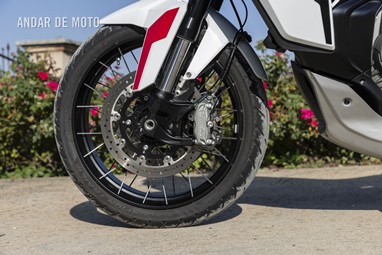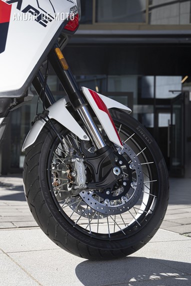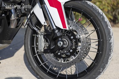 As belas jantes com raios tangenciais e aros de alumínio calçam pneus Pirelli Scorpion Trail 3, um 120/70-R19 na frente e um relativamente estreito 170/60-R17 atrás, este último montado num aro estreito de 4,50 polegadas. As pinças de travão Brembo Stylema Monoblock de quatro pistões, com montagem radial, atuam nos dois discos dianteiros de 320 mm, enquanto o disco traseiro, de 280 mm, conta com uma pinça de dois pistões. O ABS Bosch Cornering pode ser desativado no modo de condução Offroad.