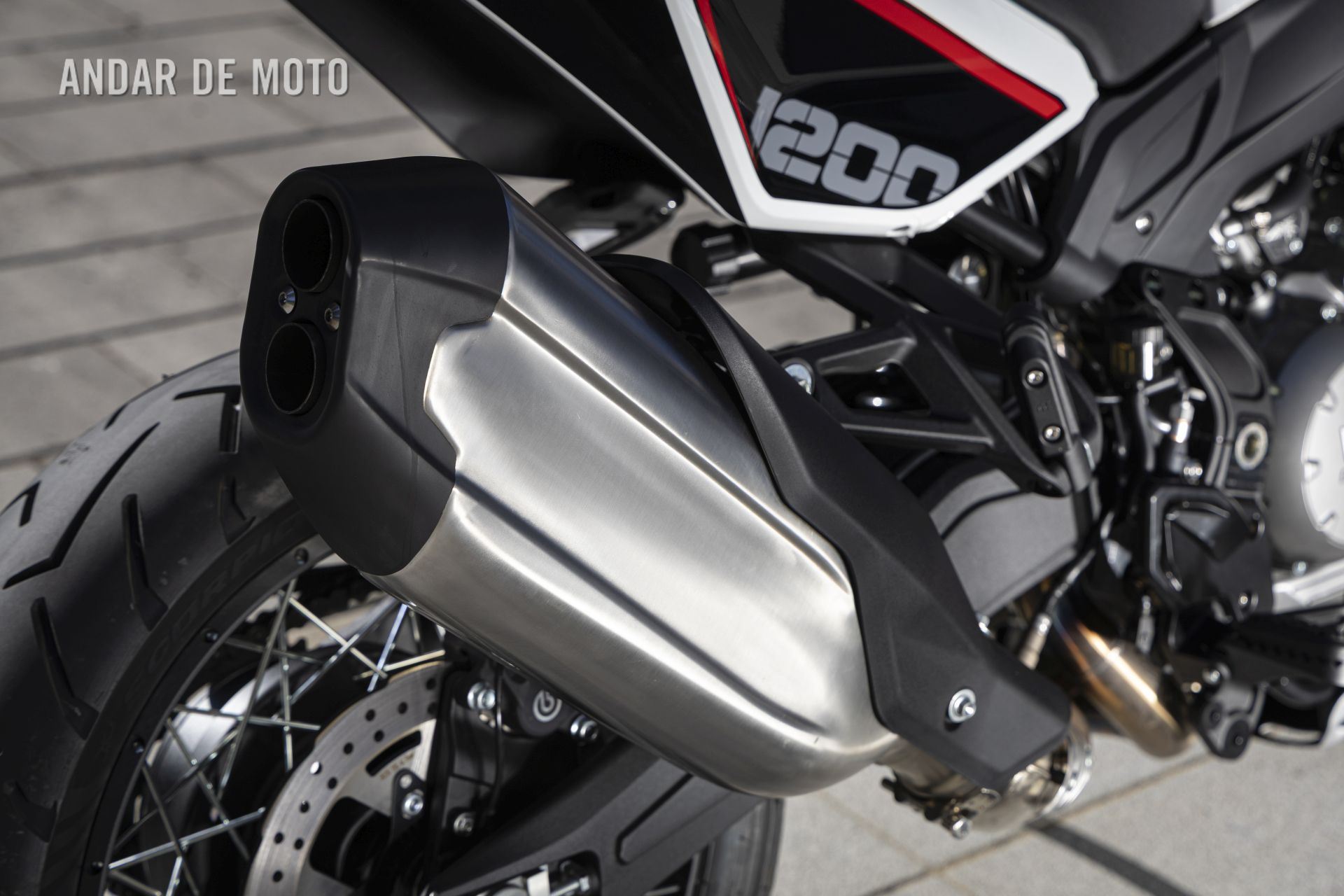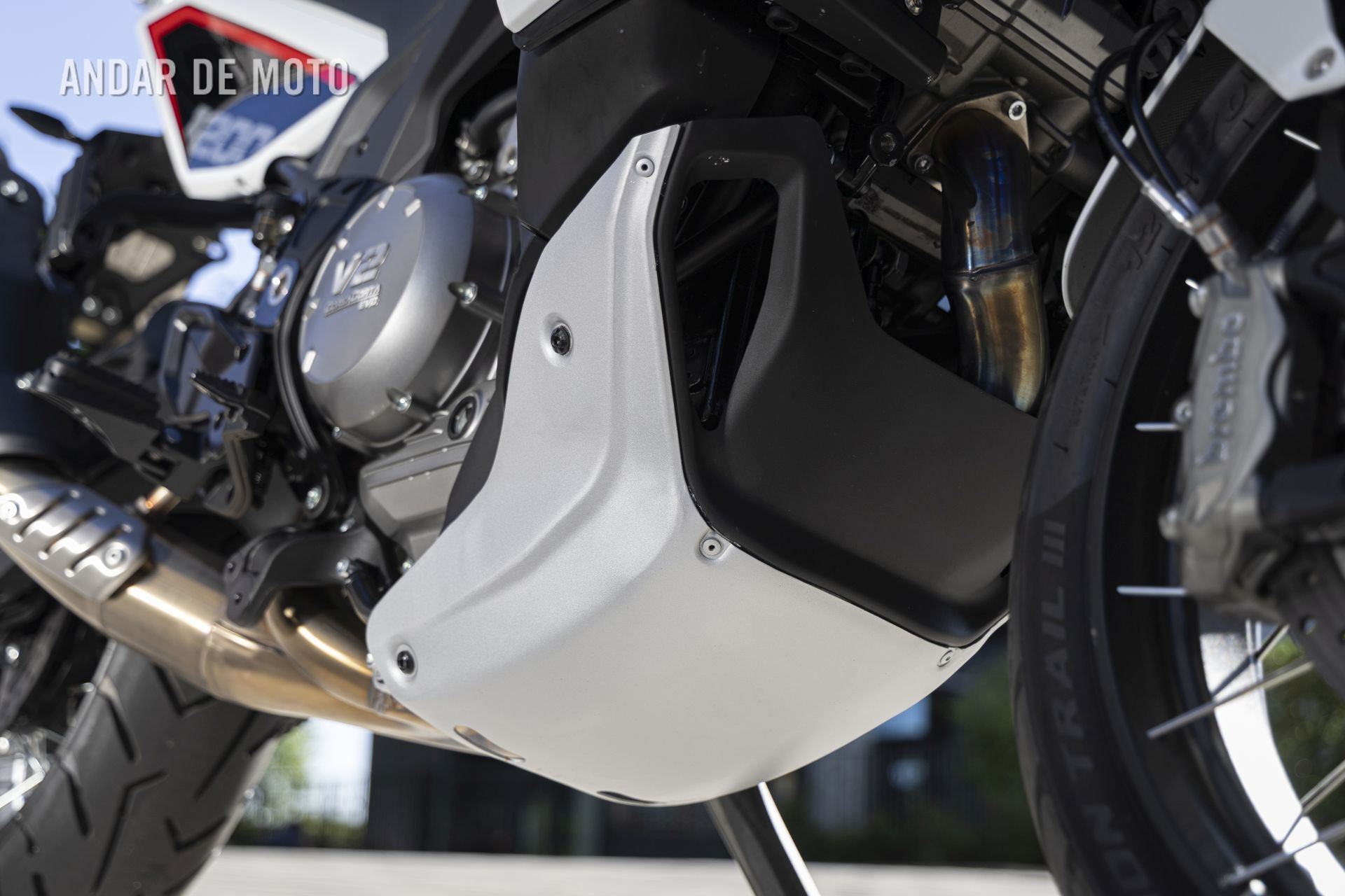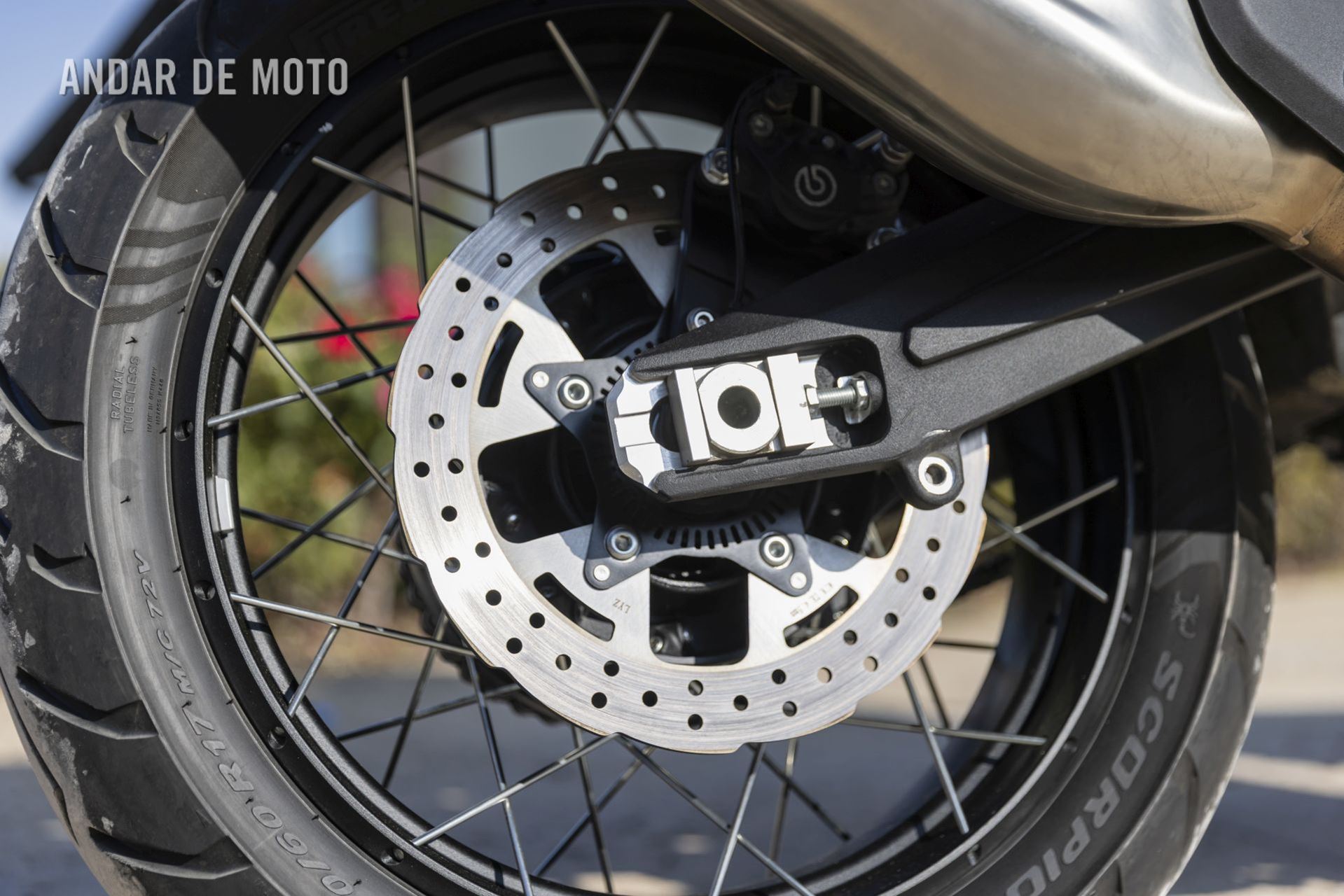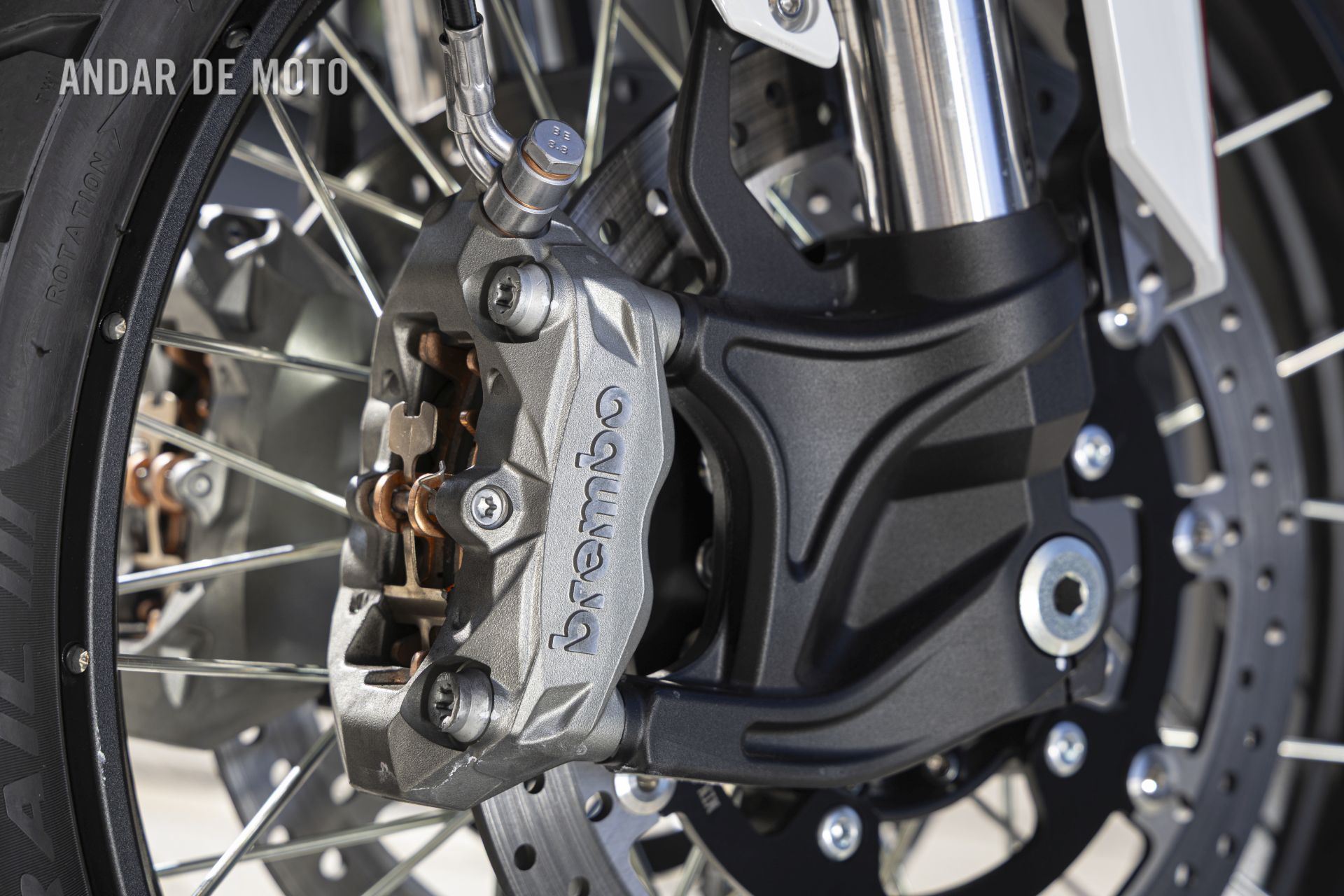 As belas jantes com raios tangenciais e aros de alumínio calçam pneus Pirelli Scorpion Trail 3, um 120/70-R19 na frente e um relativamente estreito 170/60-R17 atrás, este último montado num aro estreito de 4,50 polegadas. As pinças de travão Brembo Stylema Monoblock de quatro pistões, com montagem radial, atuam nos dois discos dianteiros de 320 mm, enquanto o disco traseiro, de 280 mm, conta com uma pinça de dois pistões. O ABS Bosch Cornering pode ser desativado no modo de condução Offroad.
