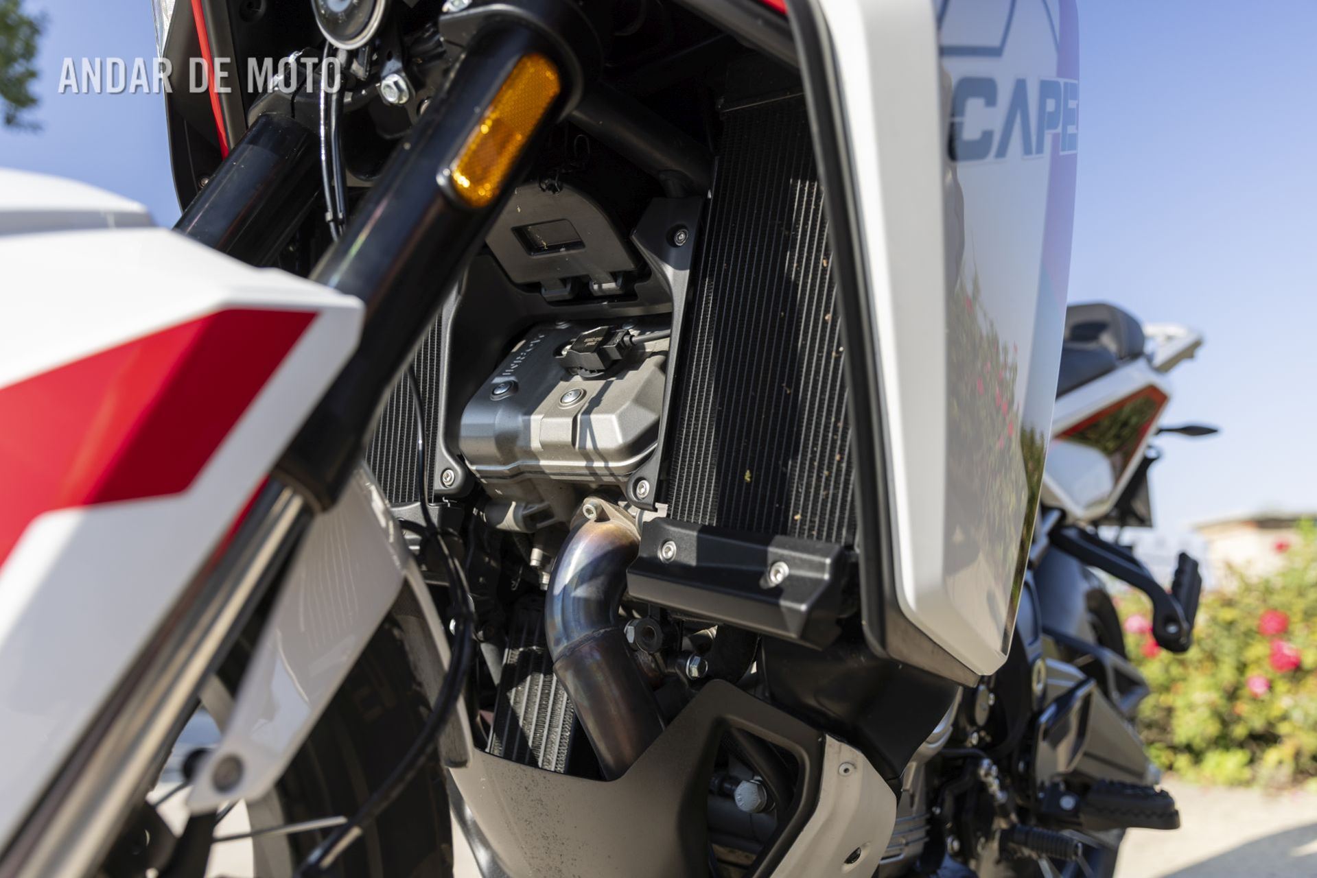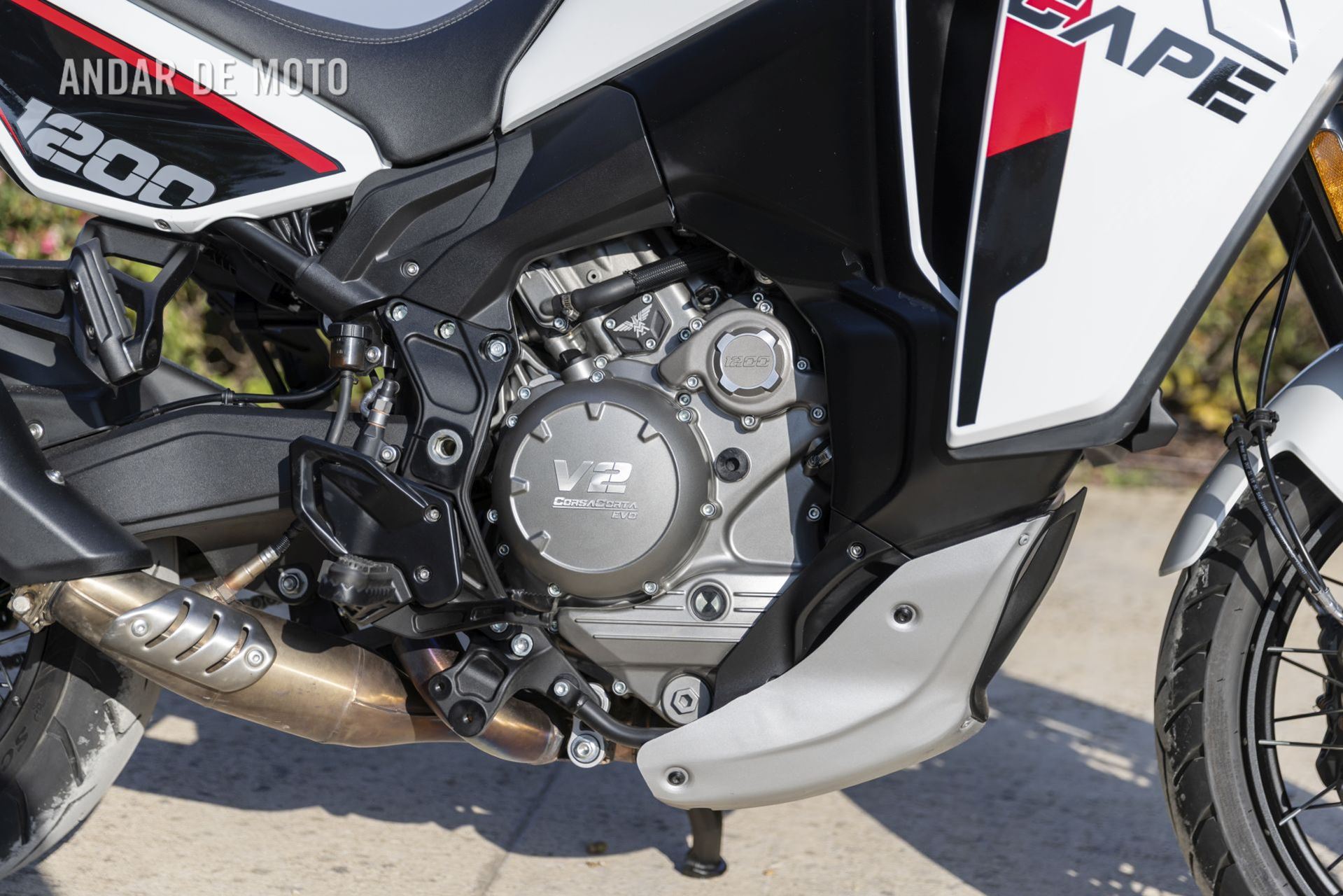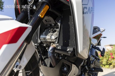 Ainda assim, é impossível não reparar no quão o motor é mecanicamente silencioso, tanto ao ralenti, ao ligá-lo pela primeira vez, como em ação na estrada. Não há o ruído característico de alguns outros motores V-twin, e o motor Moto Morini CorsaCorta também soa bastante refinado quando ronrona ao ralenti através do silenciador de escape posicionado relativamente baixo à direita. Por falar nisso, a colocação do escape demonstra que o potencial todo-o-terreno da X-Cape é algo limitado: a altura ao solo não é suficiente para terrenos muito acidentados, mas, como pude constatar numa excursão pelas estradas rurais (Strade Bianche) no meio das vinhas, ela dá-se perfeitamente bem mesmo em terrenos rochosos, desde que não nos entusiasmemos demasiado com os saltos.