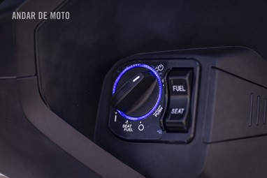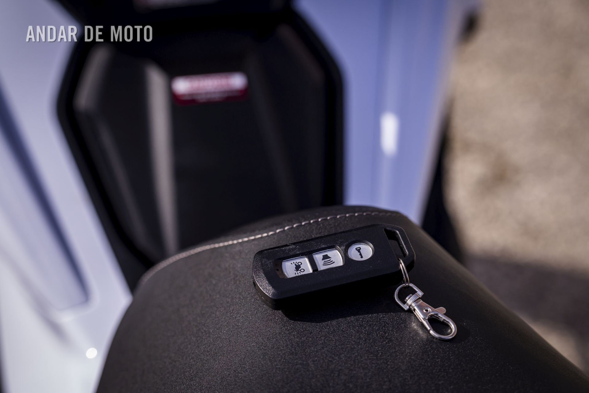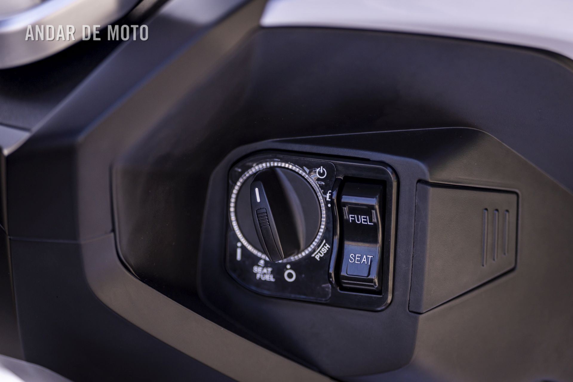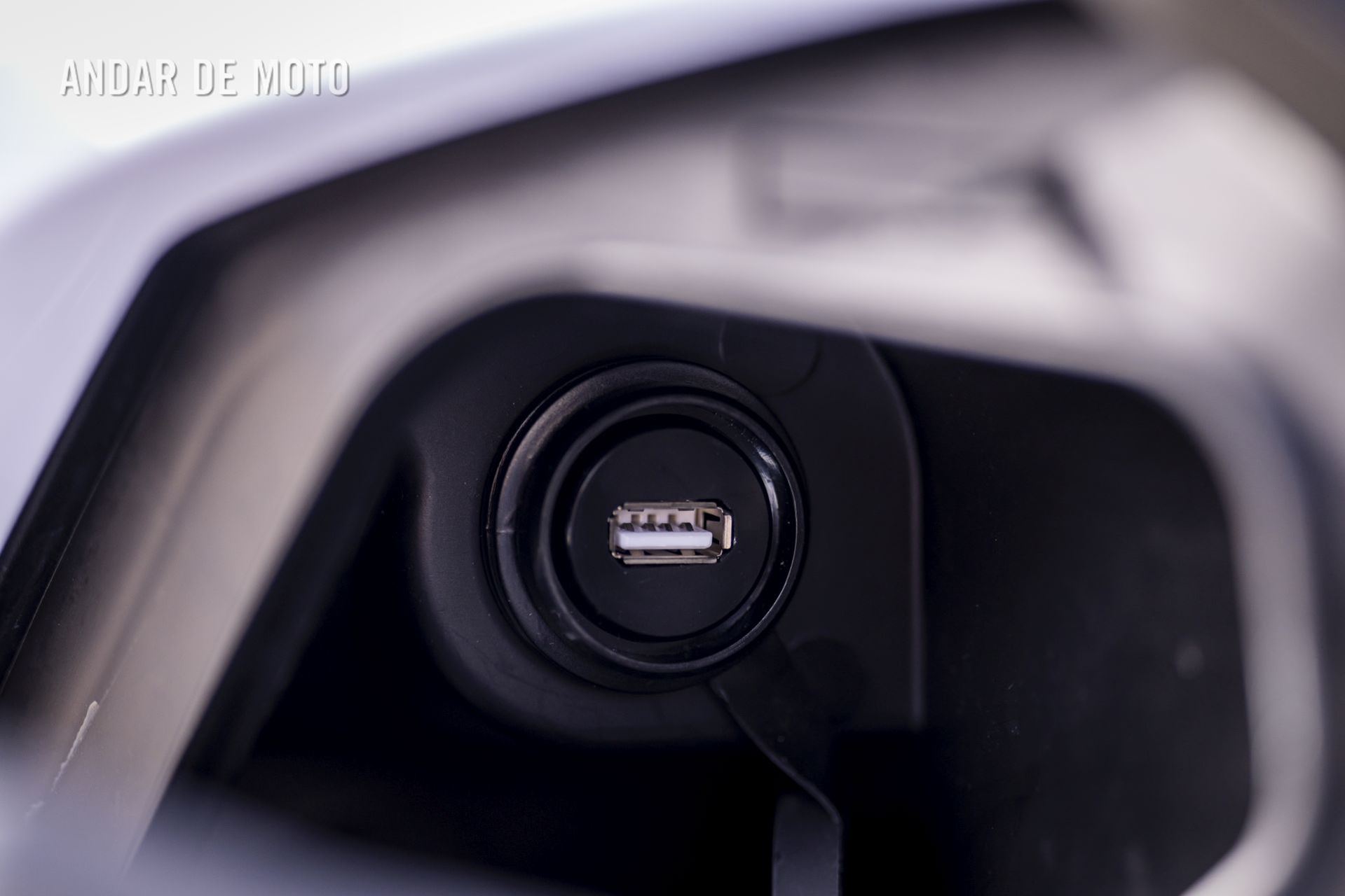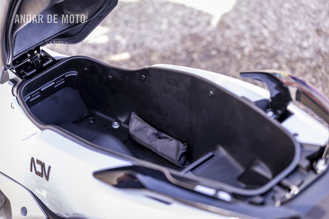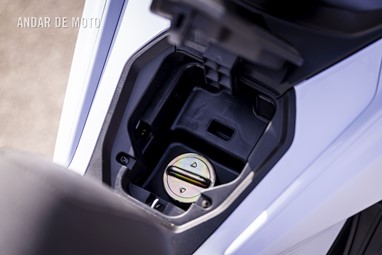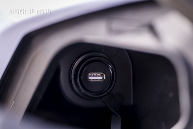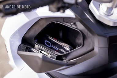 A distância entre eixos relativamente curta não compromete a estabilidade do conjunto, mas não ajuda na posição de condução nem no espaço para as pernas, sobretudo para quem prefere adotar uma postura de condução com as pernas mais esticadas.Debaixo do assento existe espaço para um capacete jet não muito grande e uma segunda área de arrumação. Na lateral esquerda do escudo dianteiro, há um compartimento com bastante capacidade, perfeito para guardar o telemóvel, a carteira ou o comando da garagem e é lá que encontramos uma tomada USB. Pena que não tenha fechadura.