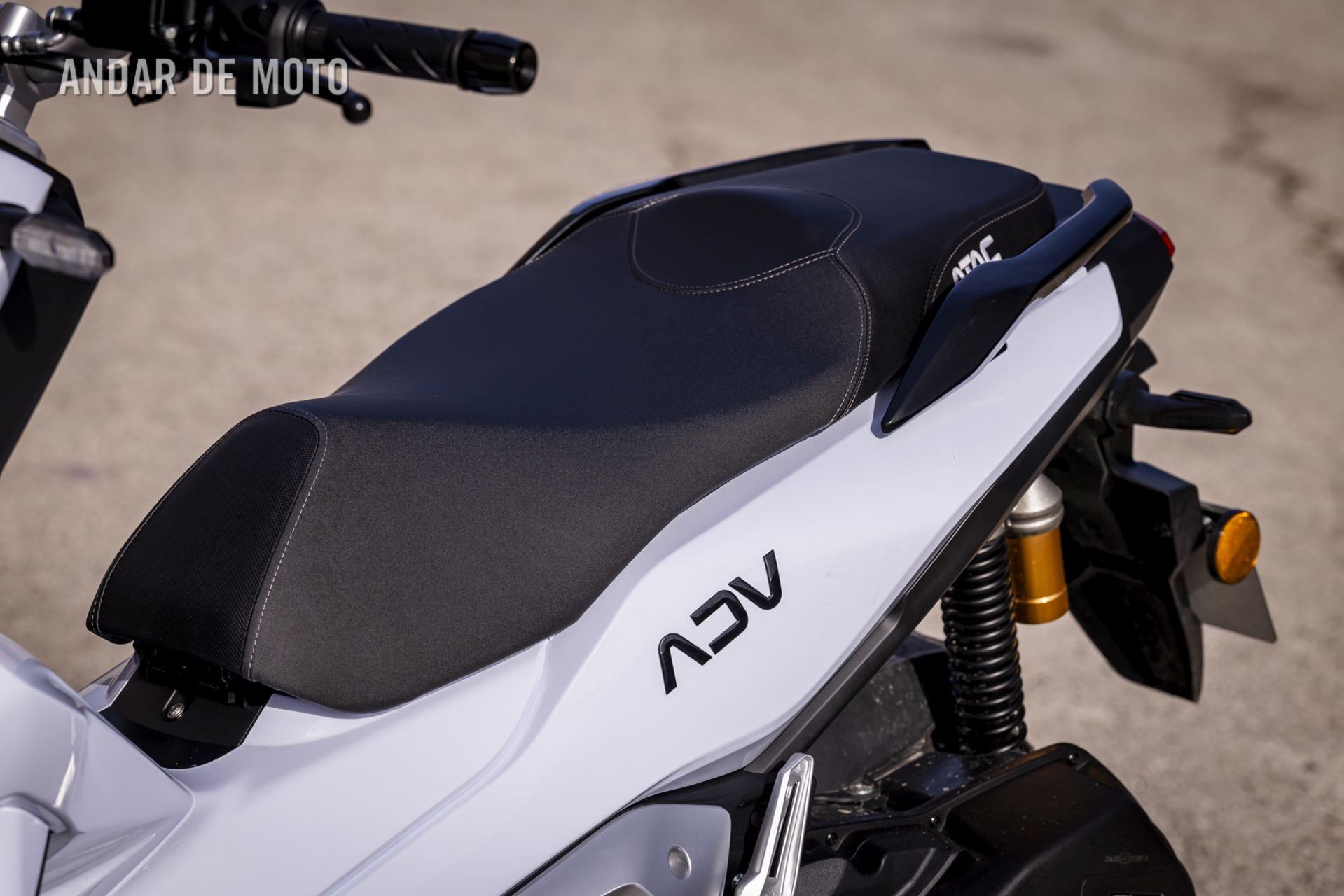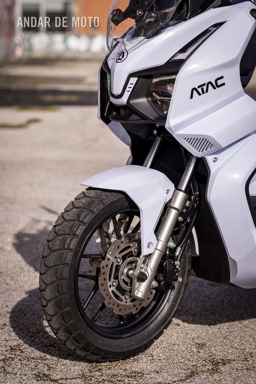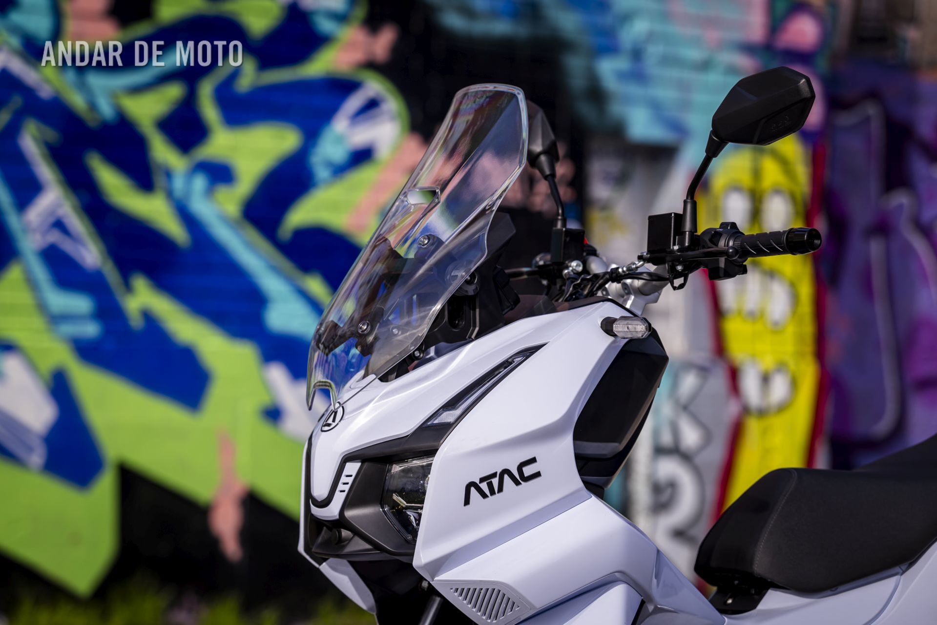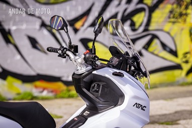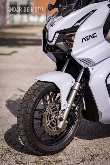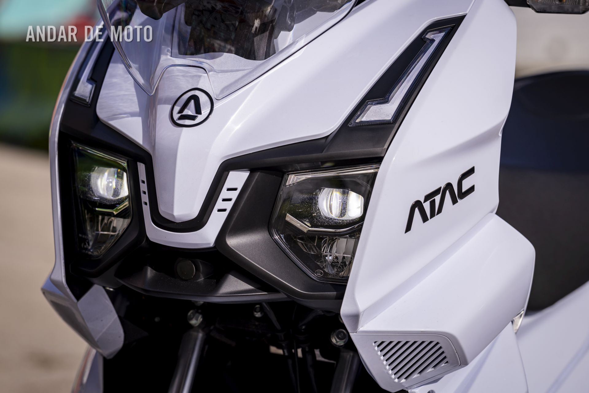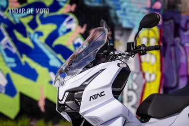 Esteticamente esta ATAC ADV 125 resulta bem. Há harmonia nas suas linhas, com uma frente mais volumosa e elevada, onde se destaca a iluminação bem conseguida e um pára-brisas com regulação em duas posições. Não que as performances sejam assim tão elevadas para o vento nos castigar, mas mais proteção contra os elementos é sempre bem-vinda.