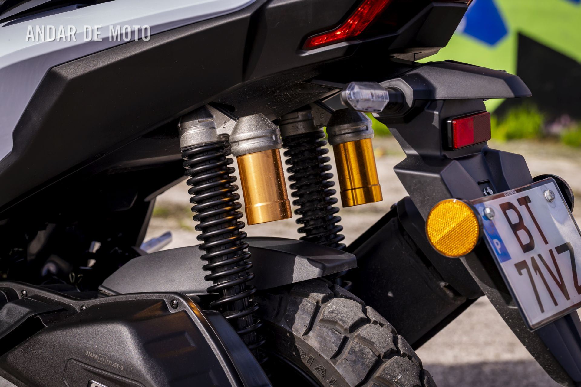Para o passageiro, o espaço é suficiente e o material que cobre o assento tem até mais aderência que o do condutor. Apesar de apresentar pegas bem desenhadas para o passageiro, falta-lhe um suporte traseiro para carga. Os dois amortecedores, com bonito efeito estético dos reservatórios de expansão, ajudam a suavizar o asfalto, mas só até determinado ponto e o seu desempenho não melhora com dois ocupantes.
